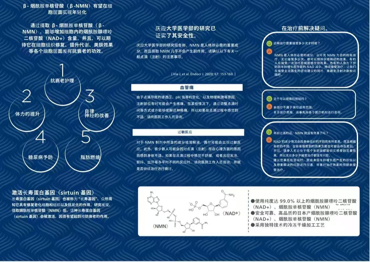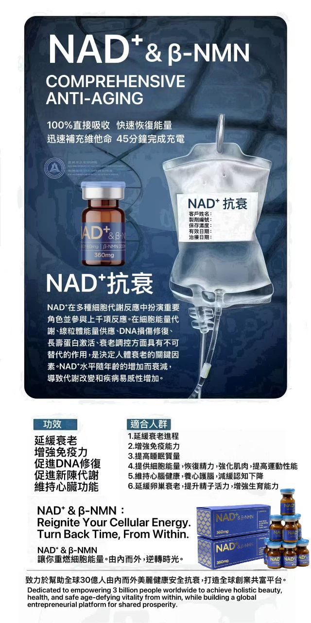 これNAD⁺ & β-NMN、細胞のアンチエイジング効果を持つ点滴静注用栄養剤です。細胞内のNAD+レベルを高め、ミトコンドリアの修復を促進し、DNAテロメアを修復し、免疫システムを強化するアンチエイジングソリューションです。